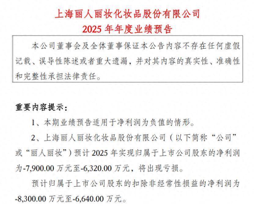1月20日盘后,丽东说念主丽妆发布2025年年度功绩预报,展望全年包摄于上市公司鞭策的净蚀本区间为6320万元至7900万元,扣非后净蚀本将达6640万元至8300万元,蚀本幅度较上年同时权贵扩大,握续深入公司转型期的霸术压力。