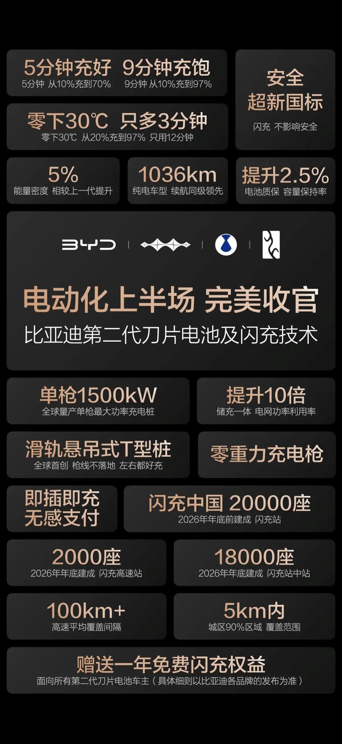 第二代刀片电板、(兆瓦)闪充2.0、DM6.0混动、天使之眼5.0智驾、全域1000V高压平台。