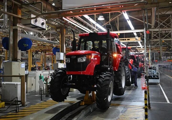 工东谈主在位于河南洛阳的国机集团中国一拖大轮拖总装线功课。新华社记者 李嘉南 摄