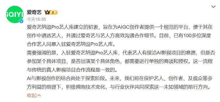 下昼四时许,爱奇艺官方发布声明称,艺东说念主库的开采初志是为AIGC创作家提供一个循序的平台。现在如故有100多位艺东说念主应许入驻AI艺东说念主库,然则否参加某个具体名堂、是否出演某个具体变装,齐需要进行单独的商谈和授权。