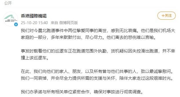 咱们对今晨北跑说念事件中两位挚爱同事的离世,感到无比追悼。他们是咱们机场天下庭的一部分,多年来缄默付出、全心奋勉。他们离去的悲伤难以言喻。