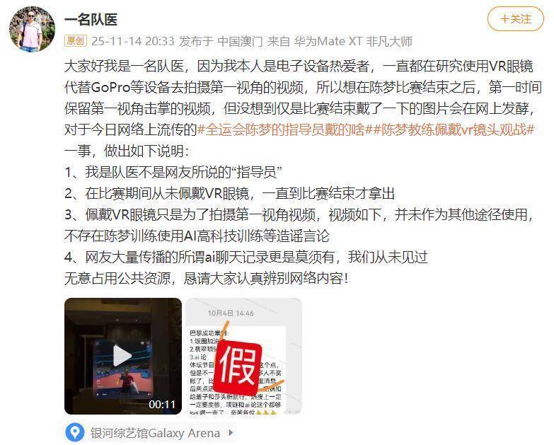 全文如下:我是别称队医,因为我本东说念主是电子建造怜爱者开yun体育网,一直王人在征询使用VR眼镜代替GoPro等建造去拍摄第一视角的视频开yun体育网,是以念念在陈梦比赛舍弃之后,第一期间保留第一视角击掌的视频,但没念念到仅是比赛舍弃戴了一下的图片会在网上发酵,关至本日收集崇高传的“全运会陈梦的疏导员戴的啥”“陈梦教养捎带vr镜头不雅战”一事,作念出如下讲明:1、我是队医不是网友所说的“疏导员”2、在比赛技艺从未捎带VR眼镜,一直到比赛舍弃才拿出3、捎带VR眼镜仅仅为了拍摄第一视角视频,视频如下,并未行为其他路线使用,不存在陈梦锻真金不怕火使用AI高技术锻真金不怕火等造滥调论4、网友大宗传播的所谓AI聊天纪录更是莫须有,咱们从未见过不测占用民众资源,恳请众人矜重分辩收集实质!