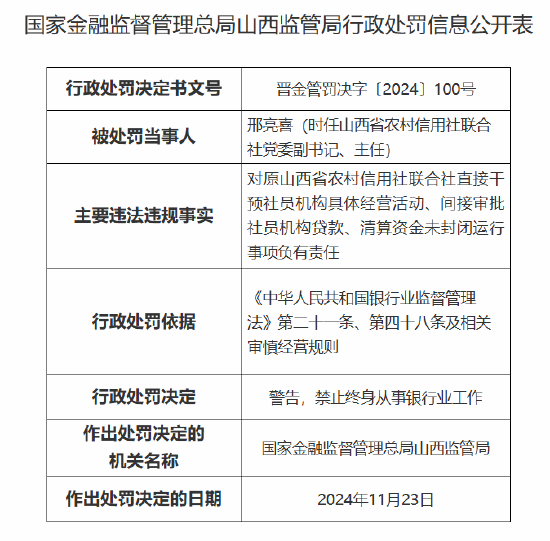 11月29日金融一线音书,国度金融监督科罚总局山西监管局行政处罚信息公开表闪现,时任山西省农村信用社纠合社党委副秘书、主任邢亮喜,对原山西省农村信用社纠合社班师干豫社员机构具体规画活动、障碍审批社员机构贷款、算帐资金未紧闭运转事项负有包袱,被监管劝诫,并壅塞终生从事银行业职责。